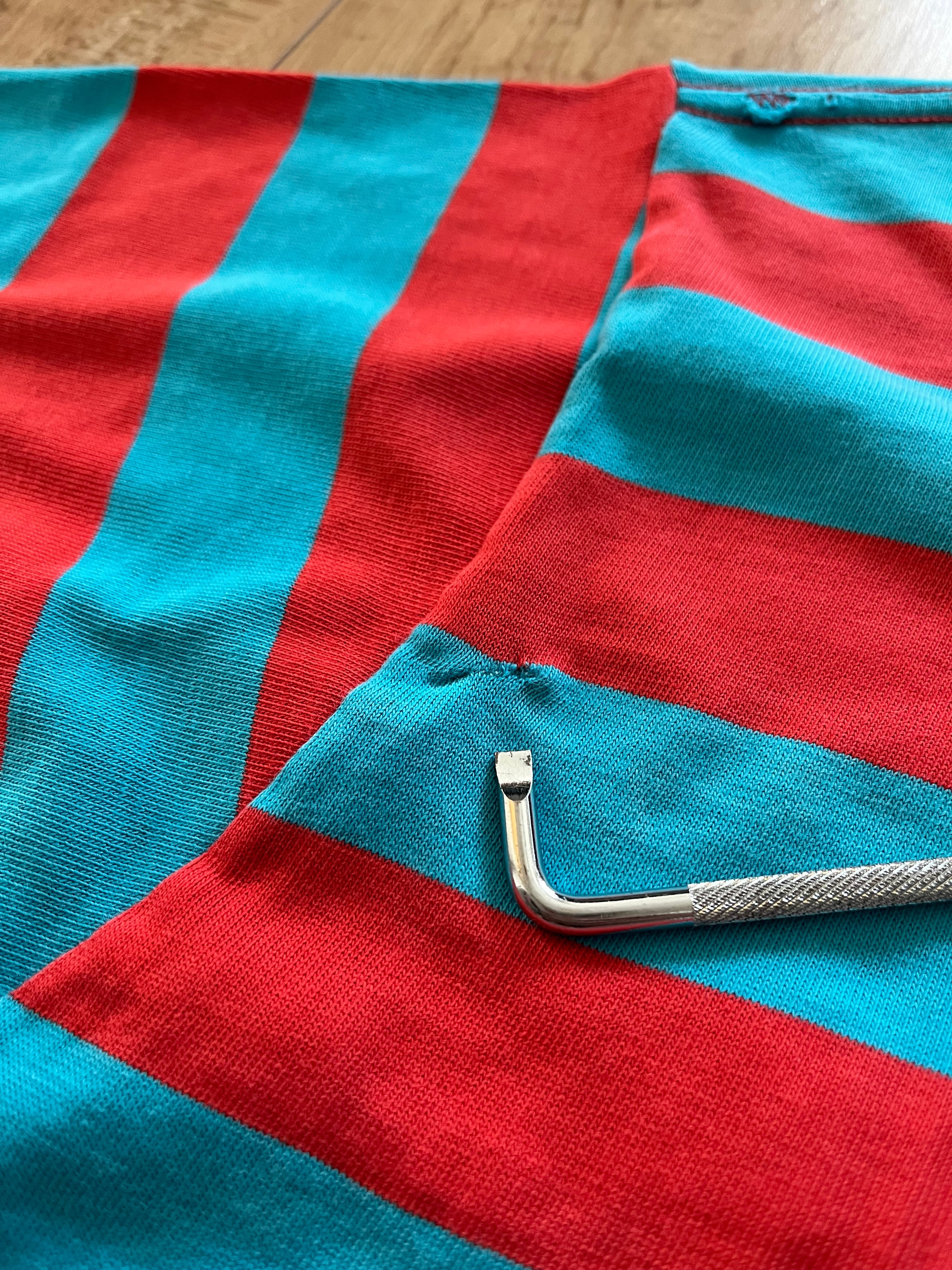 赤と水色の太ピッチボーダーパターン。